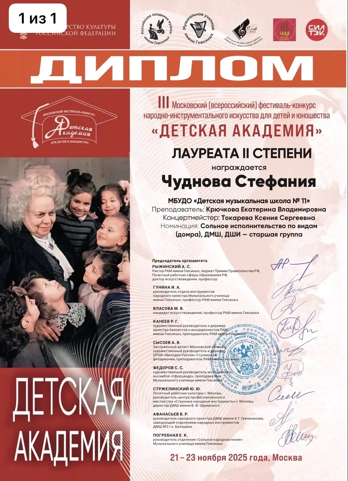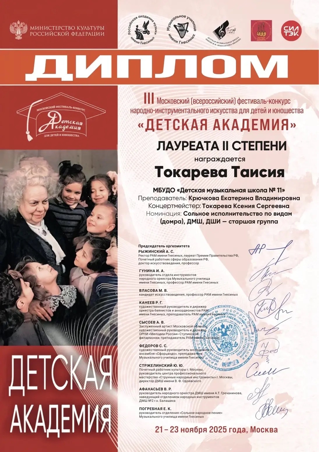 Поздравляем с прекрасными результатами учащихся класса Екатерины Владимировны Крючковой: Токареву Таисию и Чуднову Стефанию (конц. К. С. Токарева), которые стали Лауреатами II степени в III Московском (Всероссийском) фестивале-конкурсе народно-инструментального искусства для детей и юношества "ДЕТСКАЯ АКАДЕМИЯ"!