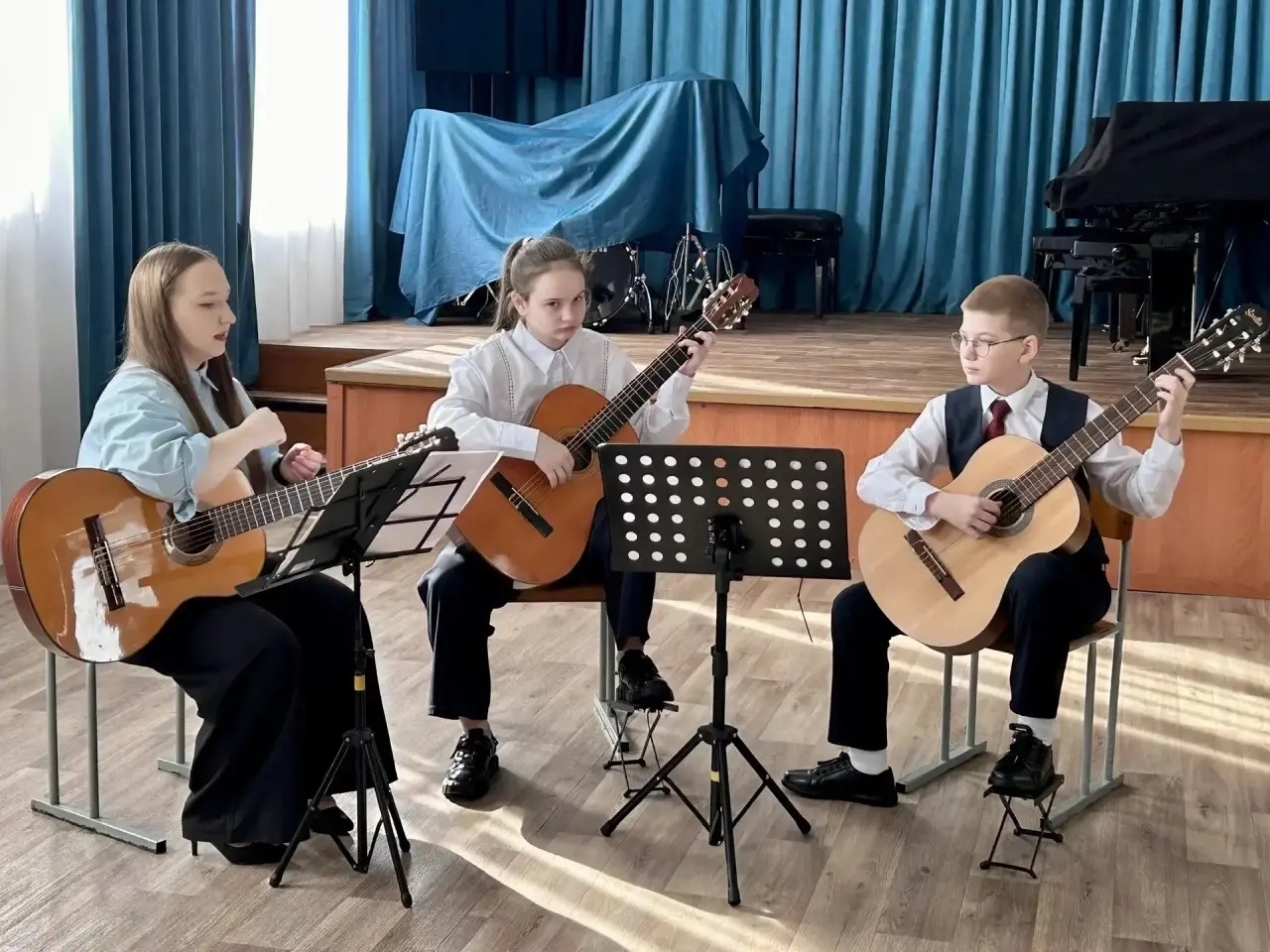1 апреля в зале нашей школы состоялся открытый урок по линии ГМО, проведённый молодым преподавателем Иваницкой Дарьей Мансуровной на тему "Ансамбль — как одна из форм работы в классе гитары".