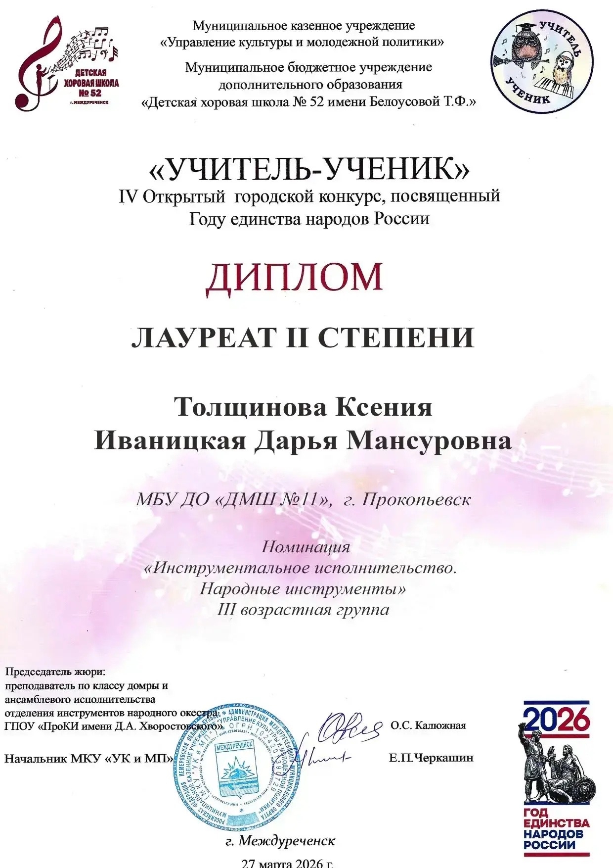 Дуэт Толщинова Ксения и Иваницкая Дарья Мансуровна стал лауреатом II степени в номинации "Учитель-ученик".