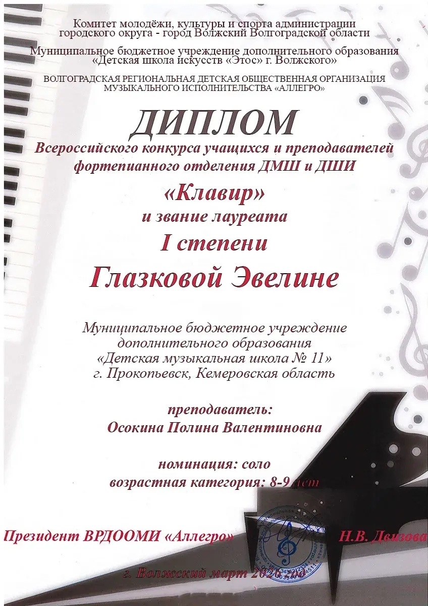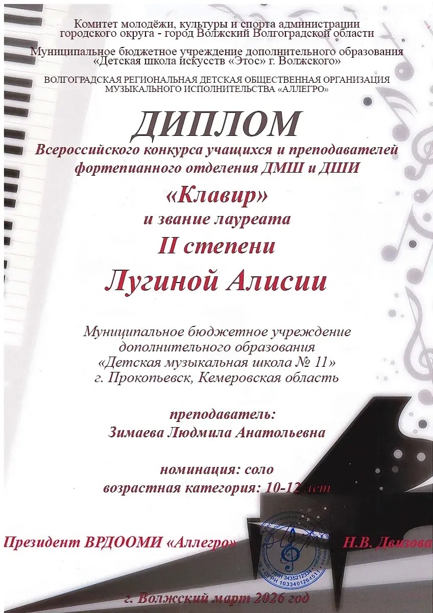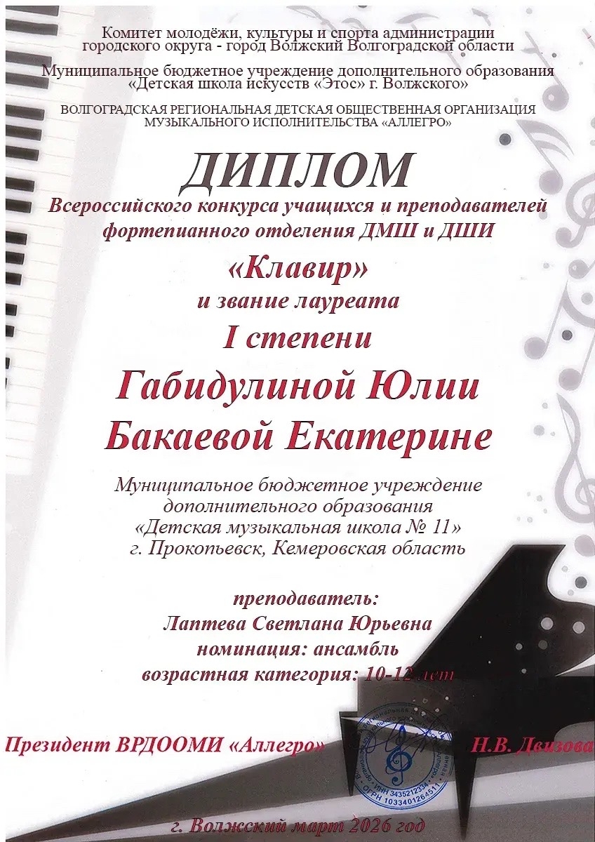 Поздравляем с победами наших юных пианистов во II Всероссийском конкурсе учащихся и преподавателей фортепианного отделения ДМШ и ДШИ "Клавир" (г. Волжский, Волгоградской обл.), который прошёл 25 марта 2026 года.