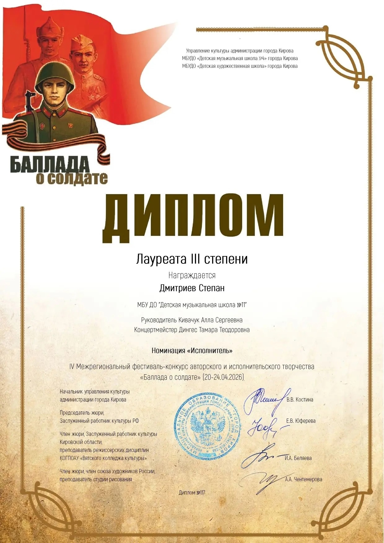 Дмитриев Степан стал лауреатом III степени IV Межрегионального фестиваля-конкурса авторского и исполнительского творчества «Баллада о солдате»!